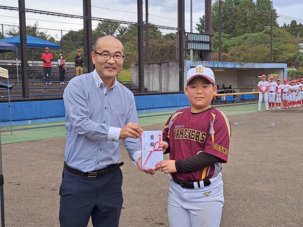 令和6年能登半島地震に際して、当クラブも以前出場した「全国ロータリークラブ野球大会」の事務局より多大なる義援金をいただきました。このお金は全国の野球を愛するロータリアンからのご支援です。そこで「野球で繋がったロータリアンのあたたかい想いを、被災地で野球を頑張っている子どもたちに届けよう」と、当クラブ後援の「かほく市学童招待野球大会」において、能登方面・内灘町・かほく市のチームに贈呈させていただきました。ご支援いただきました全国ロータリアン野球大会に関わるすべての皆さまに、心より感謝申しあげます。